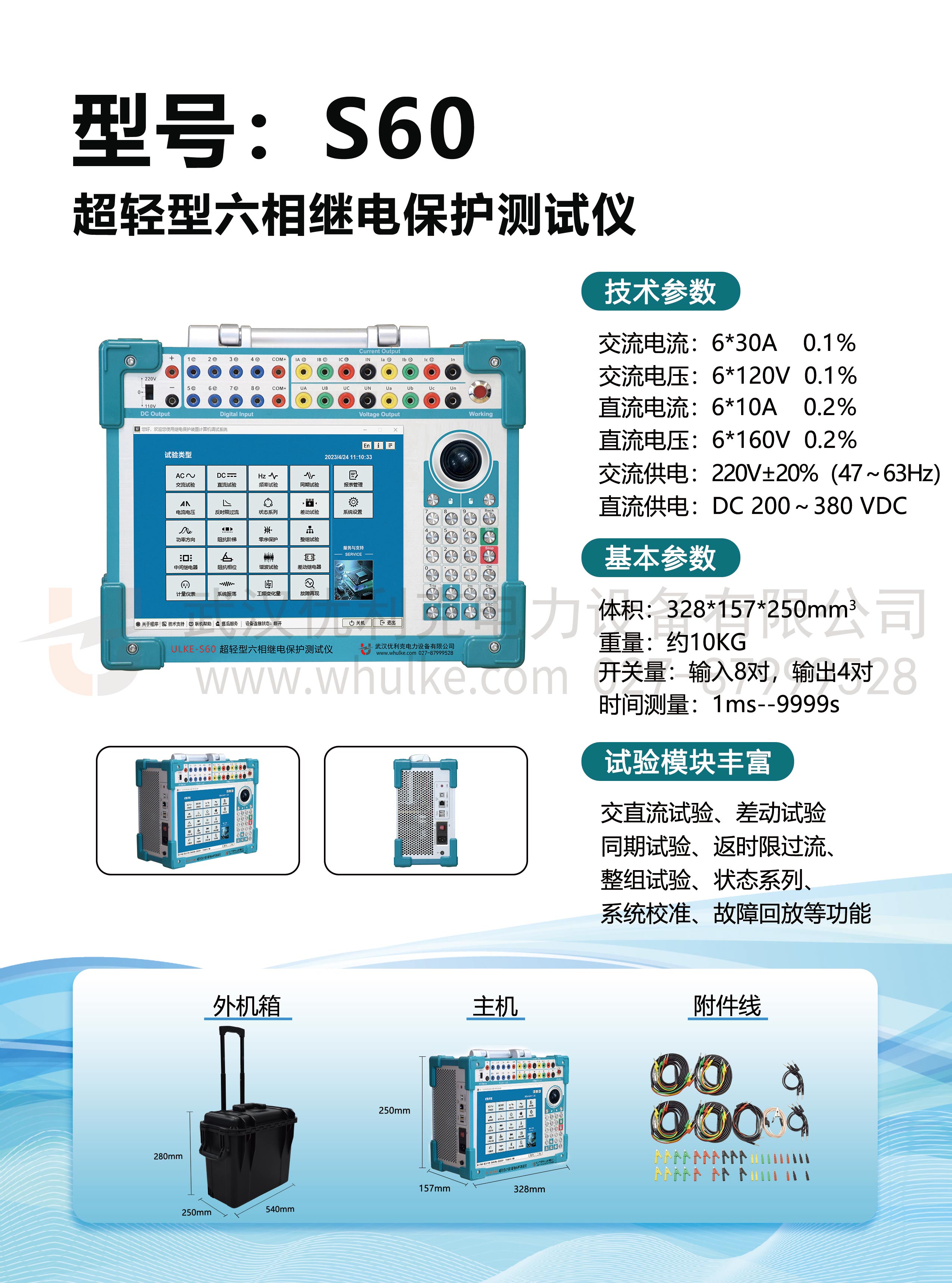 • ULKE - S60:專為小型電力設備繼電保護測試設計,體積小巧輕便,便于攜帶與現場操作。具備基礎的保護功能測試與參數測量