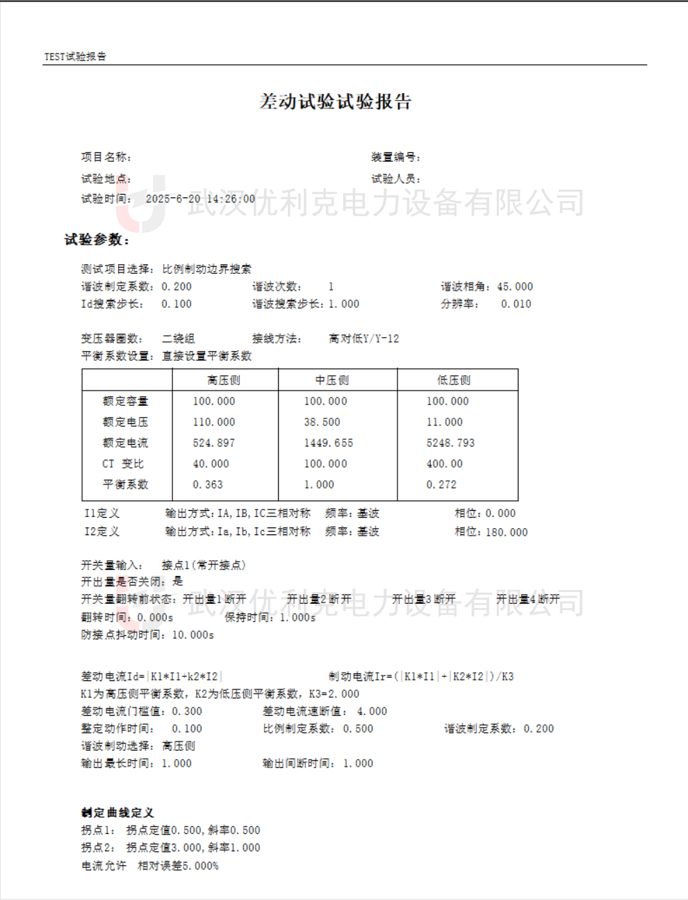 平衡系數(shù):根據(jù)CT變比和變壓器額定電流計算高低壓側(cè)的平衡系數(shù)(如高壓側(cè)Kh=1,低壓側(cè)Kl=0.795)。