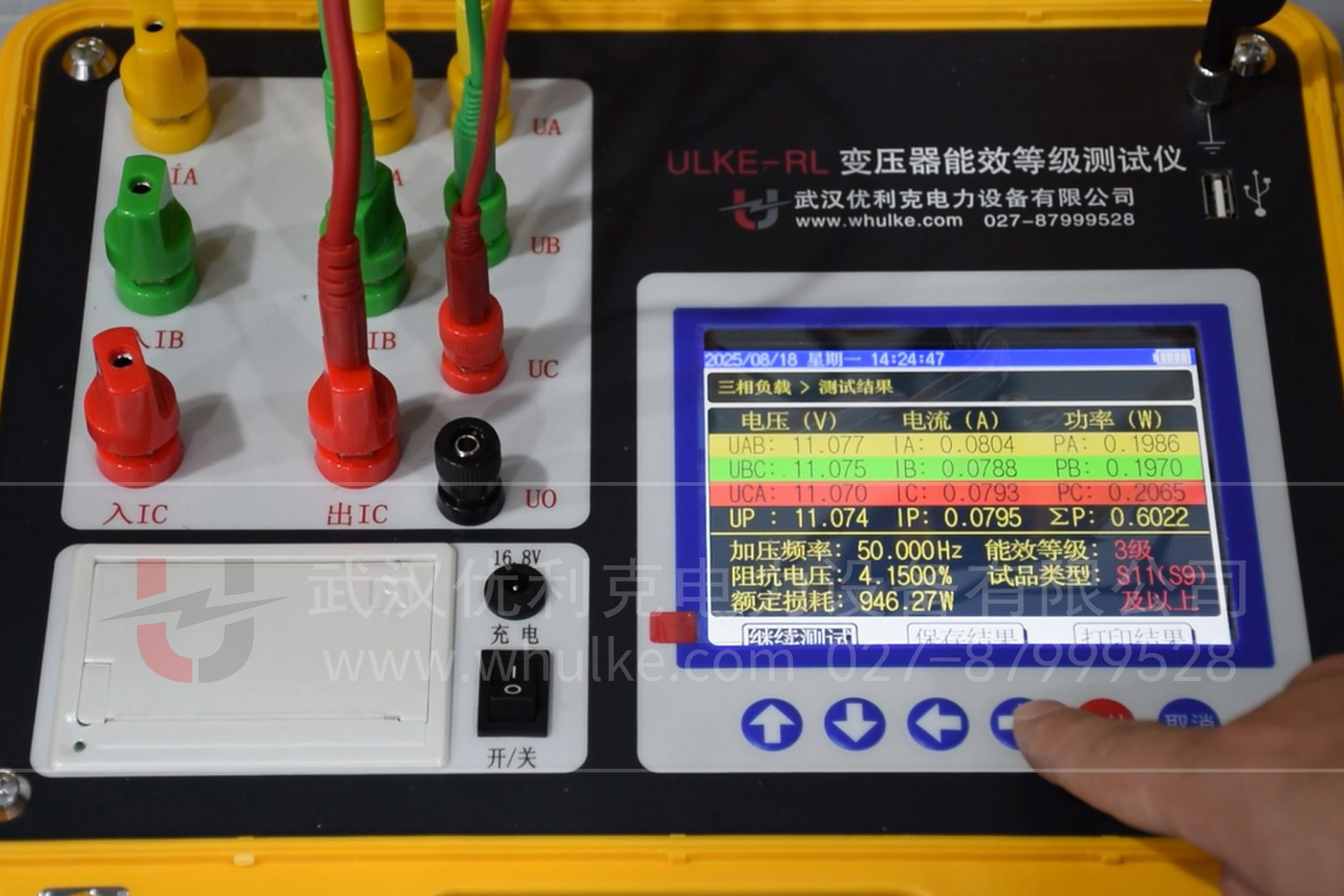 定電流,原邊加對應電壓,記錄負載損耗值);測試完成后,測試儀自動計算能效等級,保存并打印測試數據。?